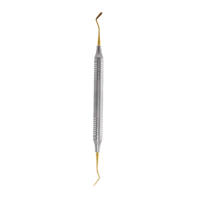 Small universal style with rounded plugger tip and a narrow paddle for initial placement and contouring of class 1st, 2nd and 3rd restorations.